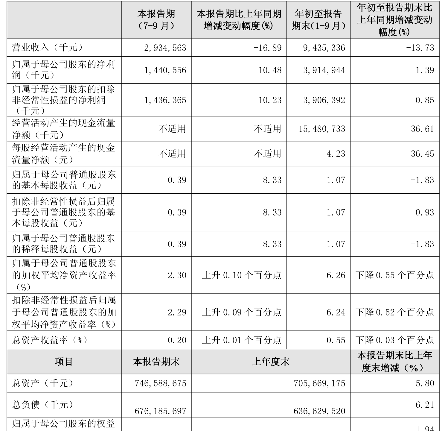 中证智能财讯贵阳银行(601997)10月31日披露2025年第三季度报告。前三季度公司实现营业总收入94.35亿元,同比下降13.73%;归母净利润39.15亿元,同比下降1.39%;扣非净利润39.06亿元,同比下降0.85%;经营活动产生的现金流量净额为154.81亿元,同比增长36.61%;报告期内,贵阳银行基本每股收益为1.07元,加权平均净资产收益率为6.26%。