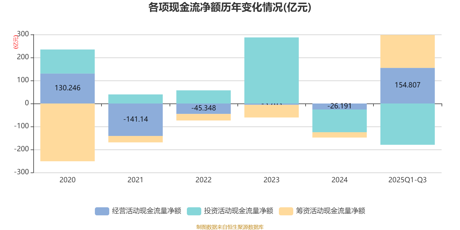 2025年前三季度,公司经营活动现金流净额为154.81亿元,同比增长36.61%;筹资活动现金流净额143.21亿元,同比增加217.9亿元;投资活动现金流净额-179.48亿元,上年同期为-94.38亿元。