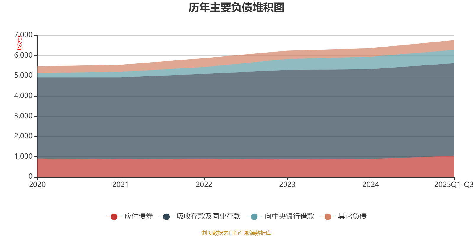 负债重大变化方面,截至2025年三季度末,公司吸收存款及同业存款较上年末增加2.78%,占公司总资产比重下降1.8个百分点;应付债券较上年末增加19.08%,占公司总资产比重上升1.57个百分点;卖出回购金融资产款较上年末增加42.13%,占公司总资产比重上升0.38个百分点;向中央银行借款较上年末增加6.81%,占公司总资产比重上升0.08个百分点。