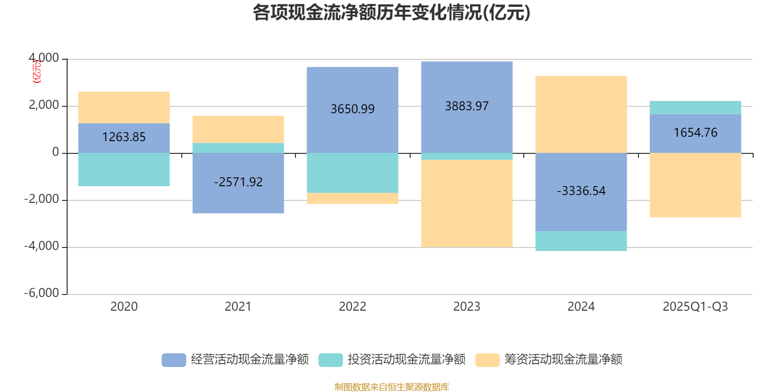 2025年前三季度,公司经营活动现金流净额为1654.76亿元,同比增加3268.74亿元;筹资活动现金流净额-2739.21亿元,同比减少4611.97亿元;投资活动现金流净额553.33亿元,上年同期为436.24亿元。