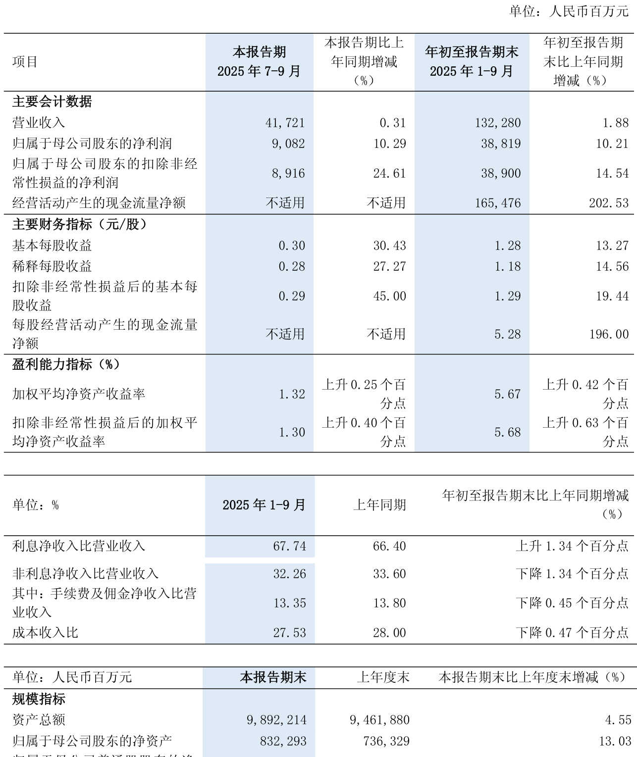 中证智能财讯浦发银行(600000)10月31日披露2025年第三季度报告。前三季度公司实现营业总收入1322.8亿元,同比增长1.88%;归母净利润388.19亿元,同比增长10.21%;扣非净利润389亿元,同比增长14.54%;经营活动产生的现金流量净额为1654.76亿元,上年同期为-1613.98亿元;报告期内,浦发银行基本每股收益为1.28元,加权平均净资产收益率为5.67%。