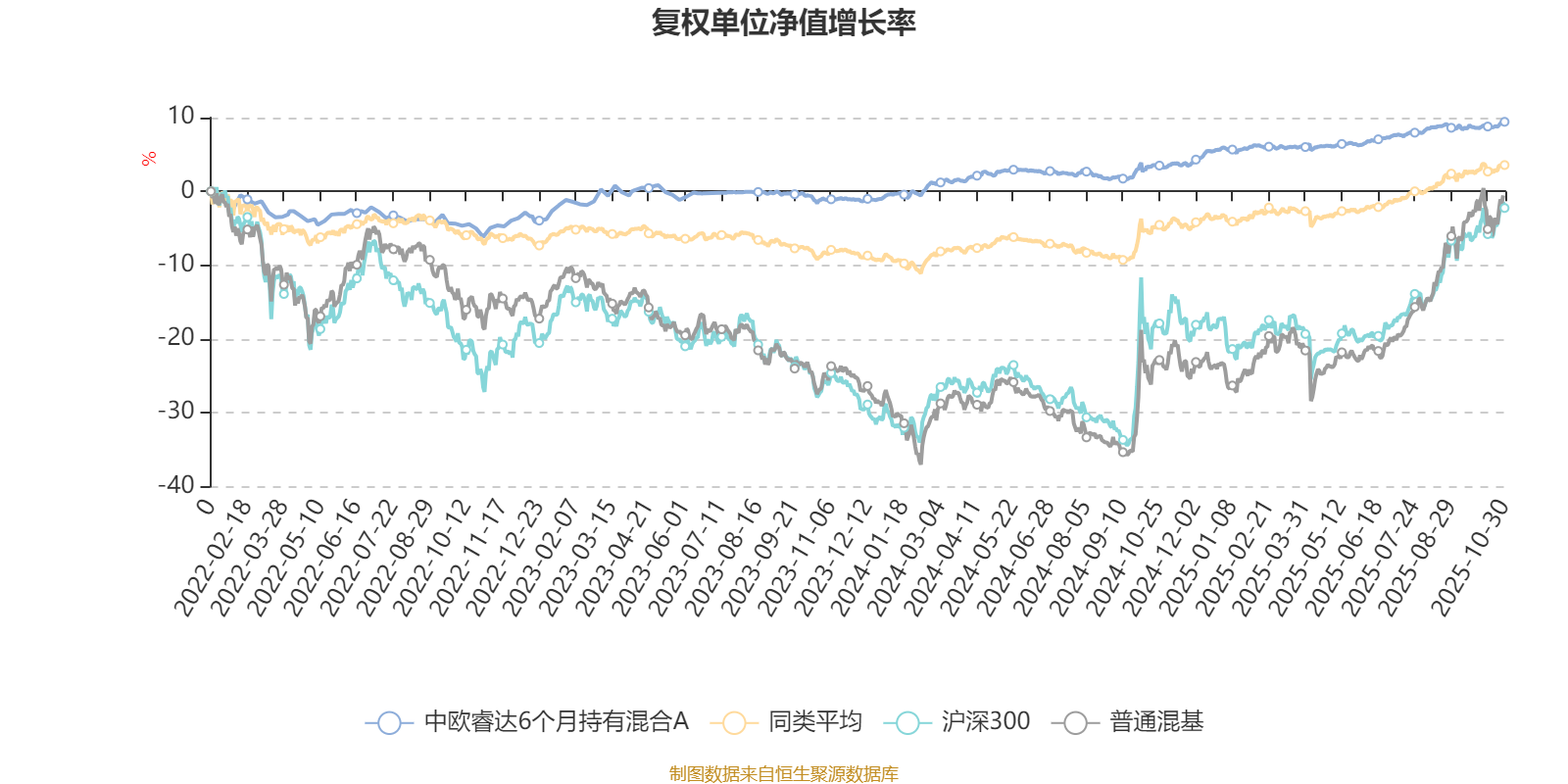 截至10月30日,中欧睿达6个月持有混合A近三个月复权单位净值增长率为1.36%,位于同类可比基金459/630;近半年复权单位净值增长率为3.17%,位于同类可比基金492/630;近一年复权单位净值增长率为6.02%,位于同类可比基金415/630;近三年复权单位净值增长率为16.61%,位于同类可比基金139/563。