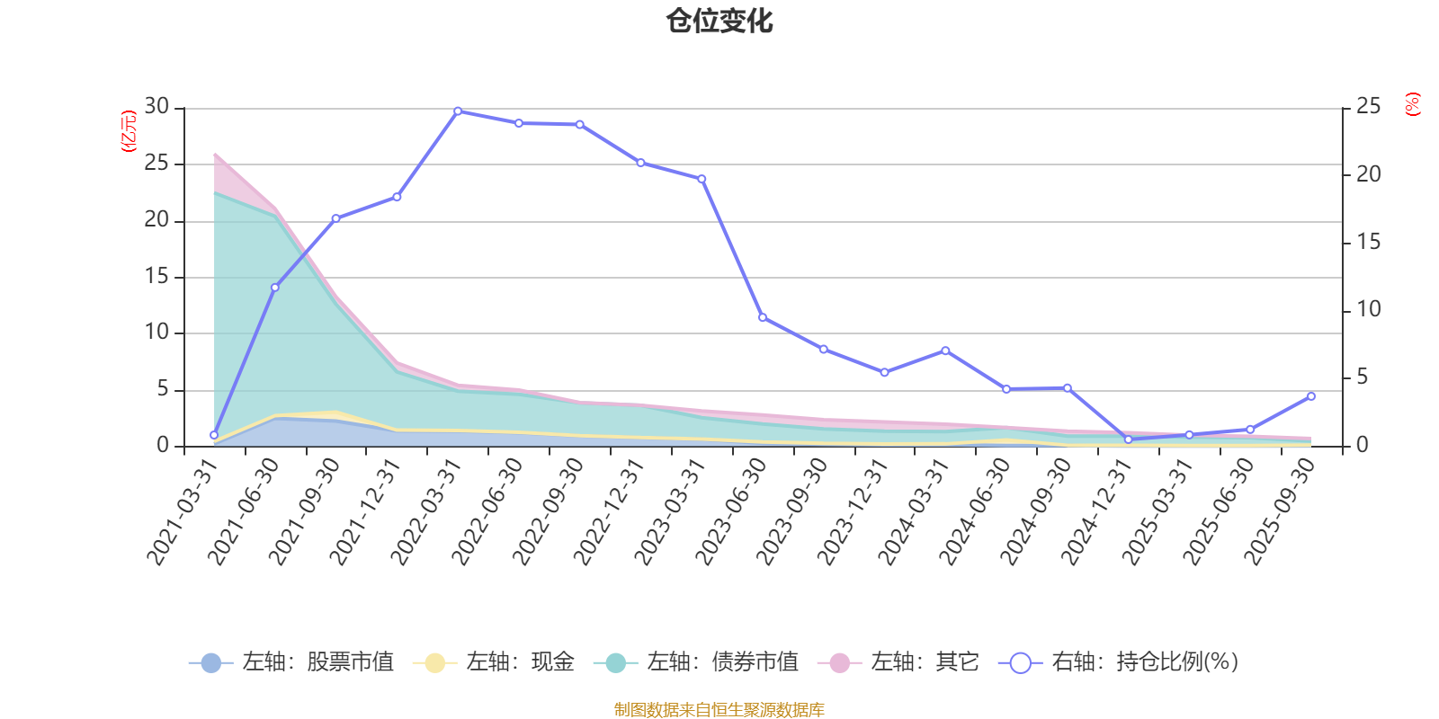据定期报告数据统计,近三年平均股票仓位为7.06%,同类平均为19.14%。2022年一季度末基金达到24.76%的最高仓位,2024年末最低,为0.5%。