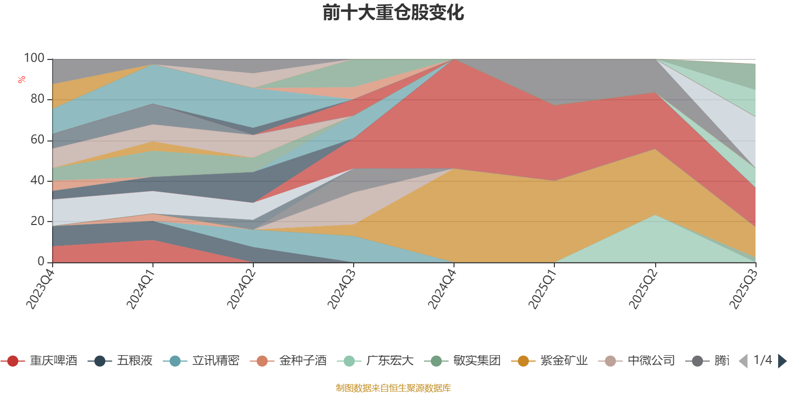该基金持股集中度较高,近2年前十大重仓股集中度长期超过60%。截至2025年三季度末,基金重仓股分别是中芯国际、宁德时代、紫金矿业、宁波银行、中国太保、中国海油、敏实集团。