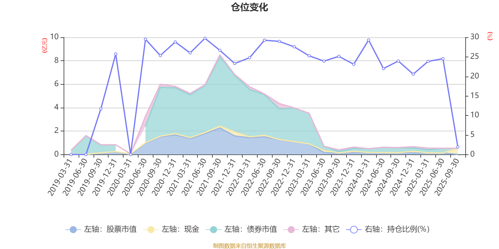 据定期报告数据统计,近三年平均股票仓位为22.6%,同类平均为19.14%。2021年上半年末基金达到29.75%的最高仓位,2025年三季度末最低,为1.95%。