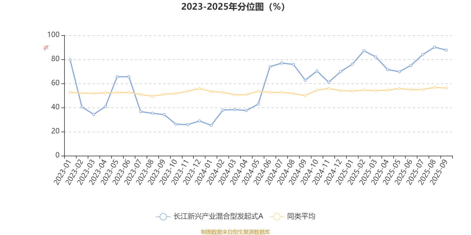 通过所选区间该基金净值增长率分位图,可以观察该基金与同类基金业绩比较情况。图为坐标原点到区间内某时点的净值增长率在同类基金中的分位数。