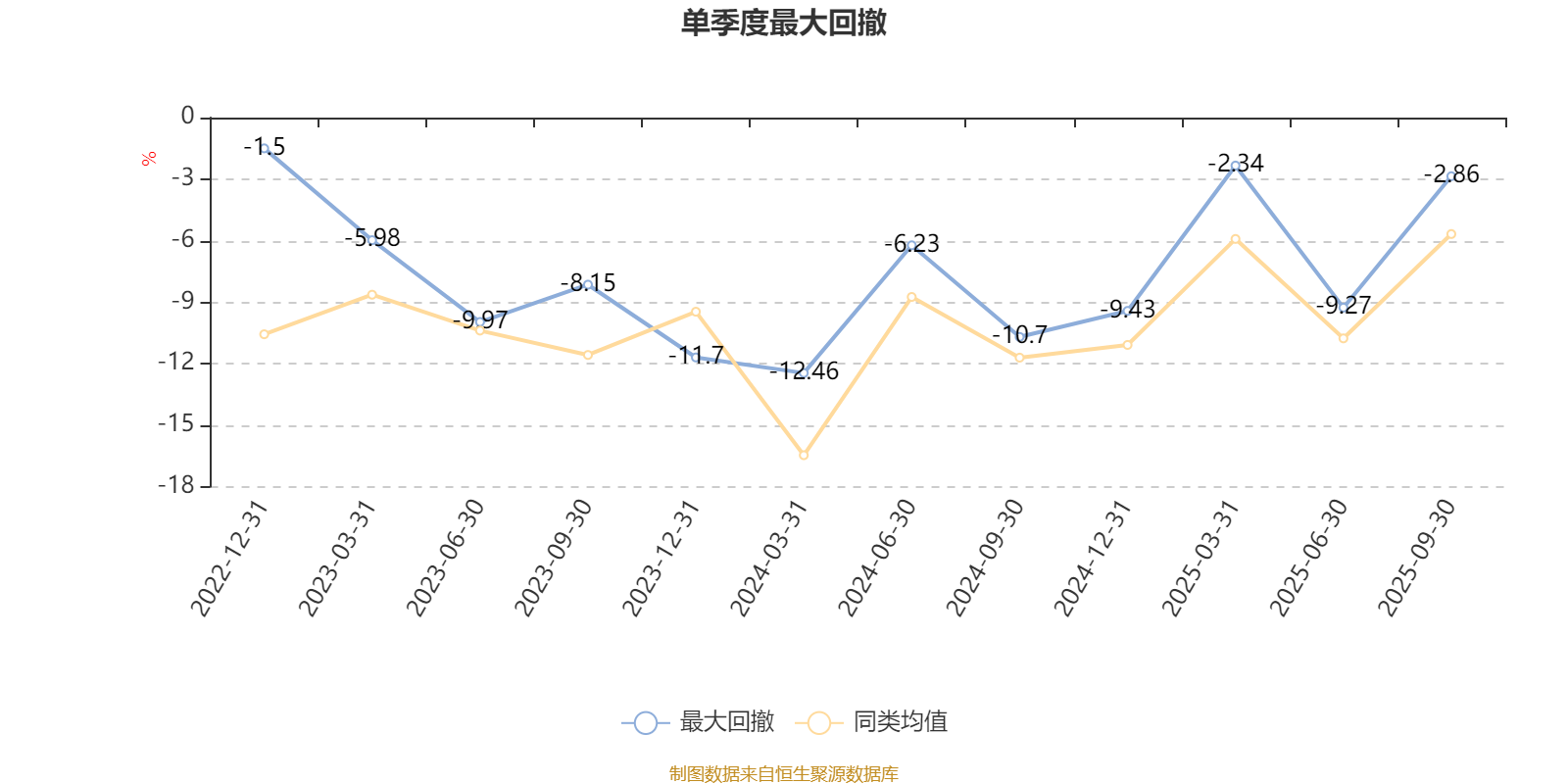 截至10月30日,基金近三年最大回撤为29.52%,同类可比基金排名115/513。单季度最大回撤出现在2024年一季度,为12.46%。