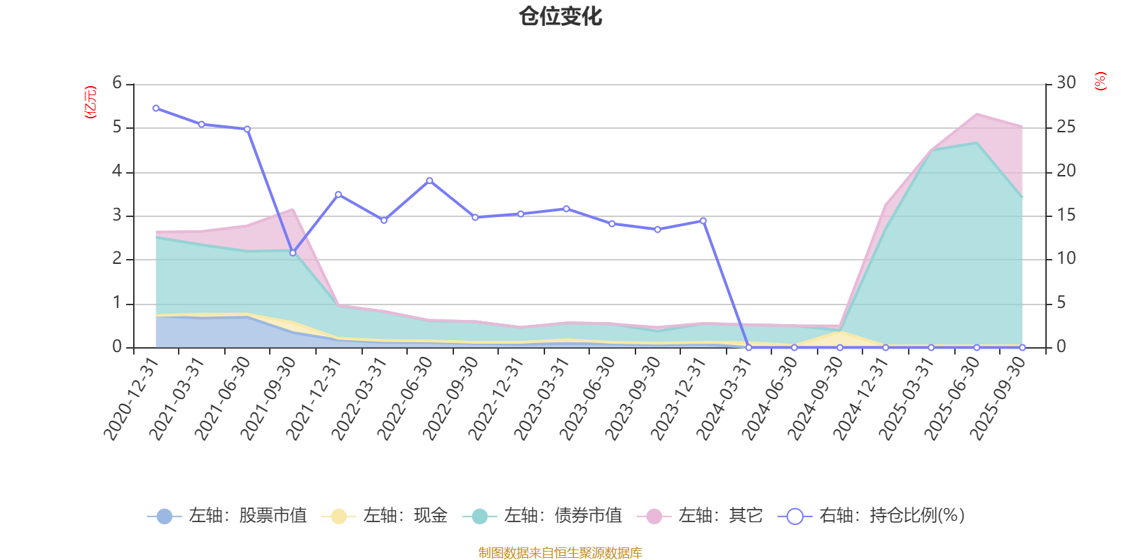 据定期报告数据统计,近三年平均股票仓位为6.08%,同类平均为19.19%。2020年末基金达到27.25%的最高仓位,2021年三季度末最低,为10.77%。
