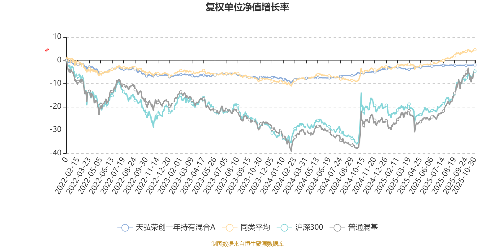 截至10月30日,天弘荣创一年持有混合A近三个月复权单位净值增长率为0.23%,位于同类可比基金615/683;近半年复权单位净值增长率为0.74%,位于同类可比基金643/683;近一年复权单位净值增长率为3.35%,位于同类可比基金588/683;近三年复权单位净值增长率为5.56%,位于同类可比基金475/609。