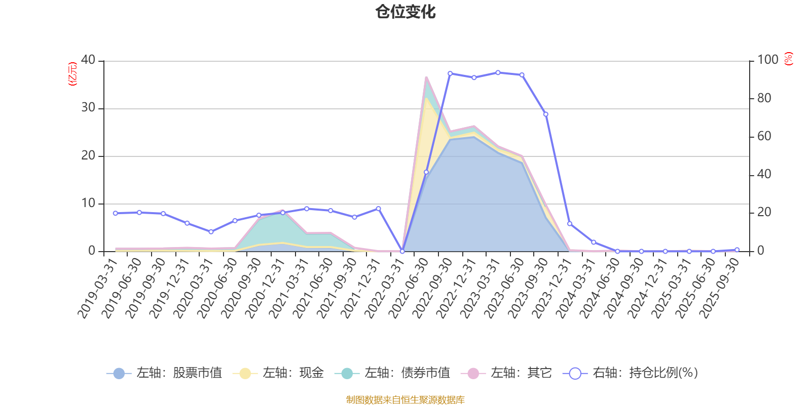据定期报告数据统计,近三年平均股票仓位为30.81%,同类平均为46.43%。2023年一季度末基金达到93.81%的最高仓位,2025年三季度末最低,为0.83%。