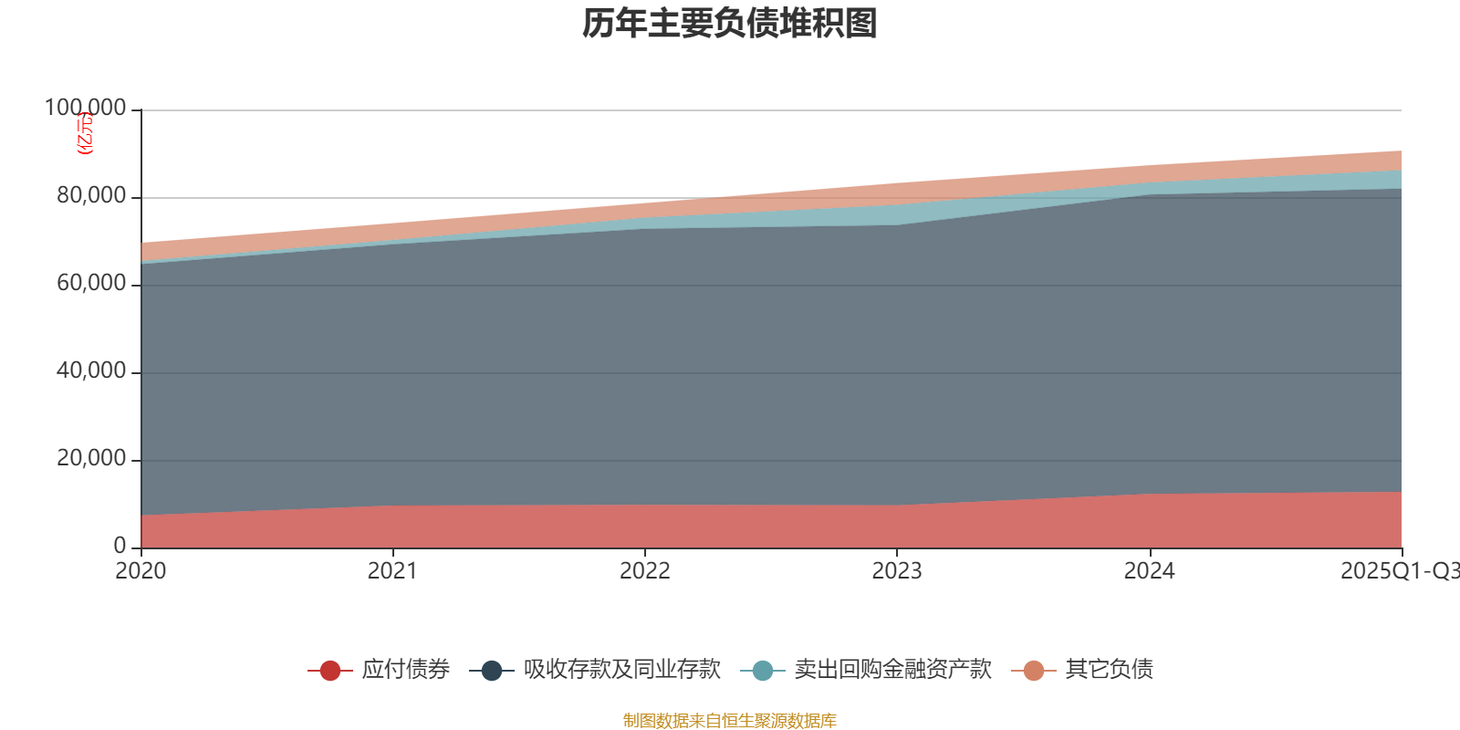 负债重大变化方面,截至2025年三季度末,公司吸收存款及同业存款较上年末增加1.28%,占公司总资产比重下降1.77个百分点;卖出回购金融资产款较上年末增加52.18%,占公司总资产比重上升1.36个百分点;向中央银行借款较上年末增加42.95%,占公司总资产比重上升0.49个百分点;衍生金融负债较上年末减少49.66%,占公司总资产比重下降0.44个百分点。