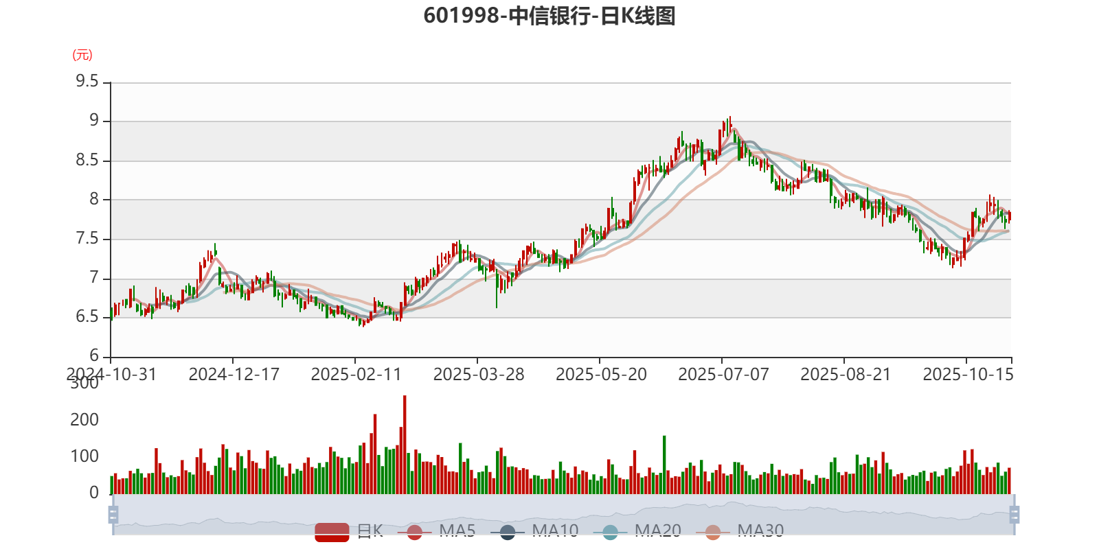 三季报显示,2025年三季度末的公司十大流通股东中,持股最多的为中国中信金融控股有限公司,占比64.747%。在具体持股比例上,香港中央结算(代理人)有限公司、中国人寿保险股份有限公司-传统-普通保险产品-005L-CT001沪持股有所上升,中国中信金融控股有限公司、香港中央结算有限公司、中国人寿保险股份有限公司-分红-个人分红-005L-FH002沪、银华富裕主题混合型证券投资基金持股有所下降。