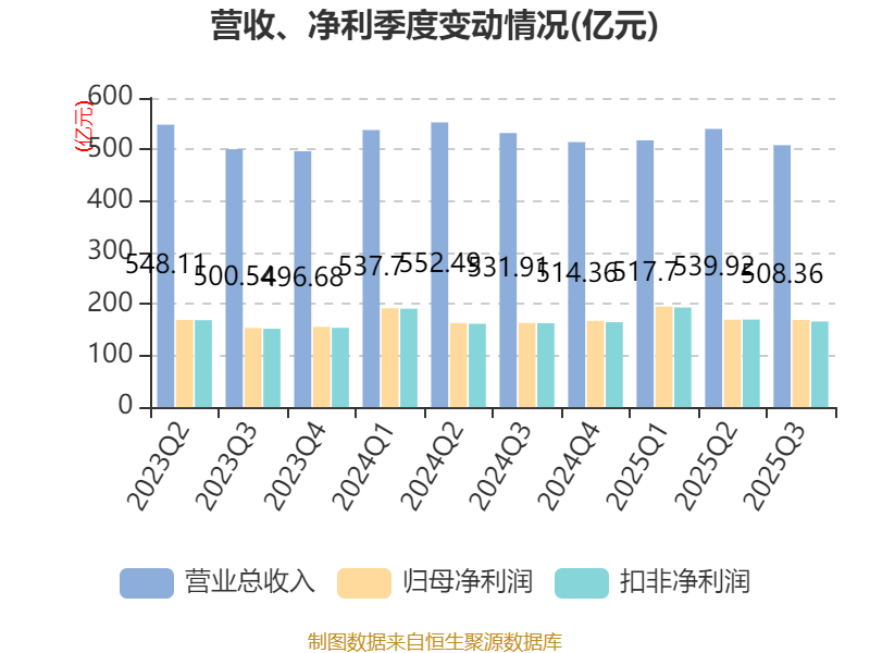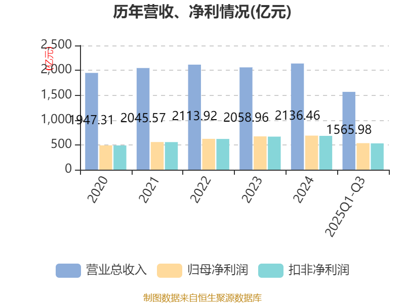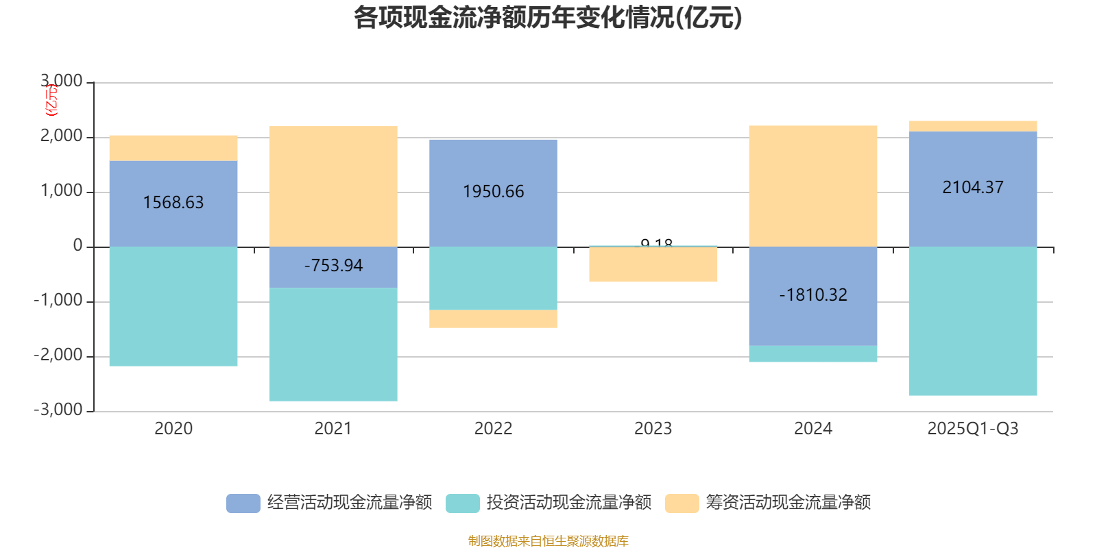 2025年前三季度,公司经营活动现金流净额为2104.37亿元,同比增加4328.34亿元;筹资活动现金流净额189.02亿元,同比减少1571.41亿元;投资活动现金流净额-2719.14亿元,上年同期为350.55亿元。