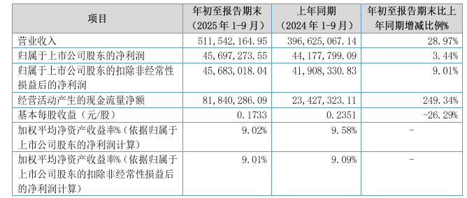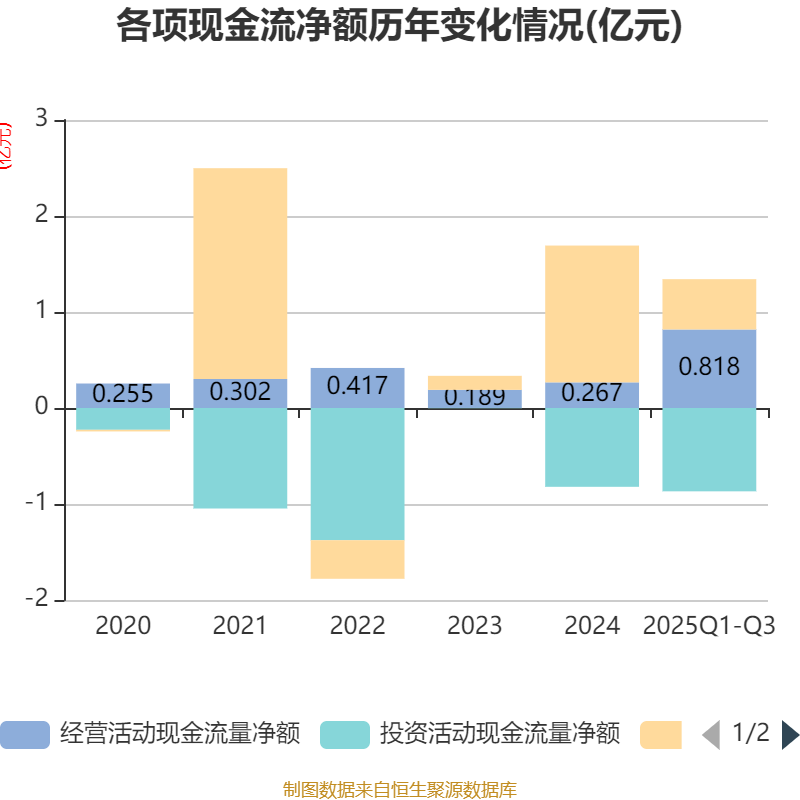 2025年前三季度,公司经营活动现金流净额为8184.03万元,同比增长249.34%;筹资活动现金流净额5239.03万元,同比减少9471.37万元;投资活动现金流净额-8676.42万元,上年同期为-1583.23万元。