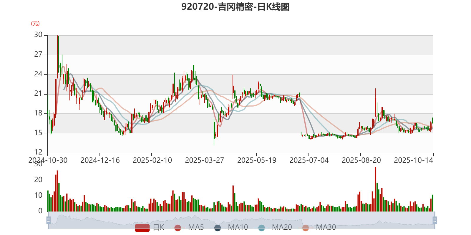 中证智能财讯吉冈精密(920720)10月30日披露2025年第三季度报告。前三季度公司实现营业总收入5.12亿元,同比增长28.97%;归母净利润4569.73万元,同比增长3.44%;扣非净利润4568.3万元,同比增长9.01%;经营活动产生的现金流量净额为8184.03万元,同比增长249.34%;报告期内,吉冈精密基本每股收益为0.1733元,加权平均净资产收益率为9.02%。