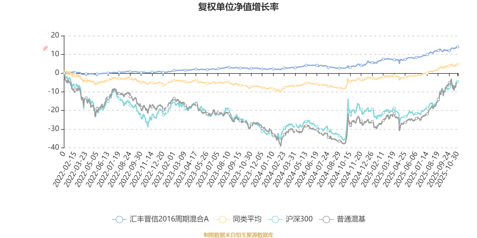 截至10月30日,汇丰晋信2016周期混合A近三个月复权单位净值增长率为2.81%,位于同类可比基金273/630;近半年复权单位净值增长率为6.27%,位于同类可比基金254/630;近一年复权单位净值增长率为10.29%,位于同类可比基金159/630;近三年复权单位净值增长率为13.85%,位于同类可比基金218/563。
