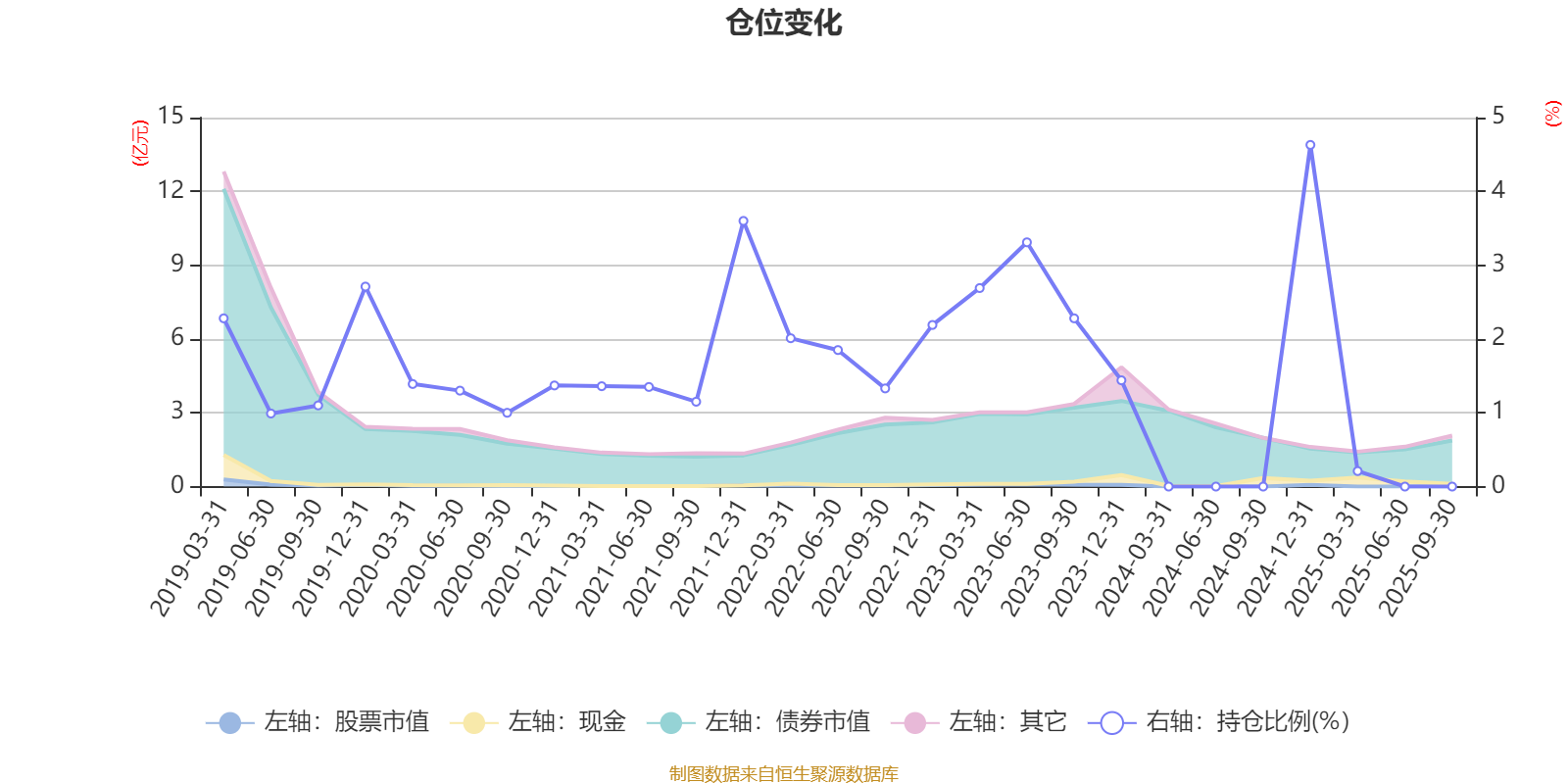 据定期报告数据统计,近三年平均股票仓位为1.4%,同类平均为19.16%。2024年末基金达到4.63%的最高仓位,2025年一季度末最低,为0.21%。