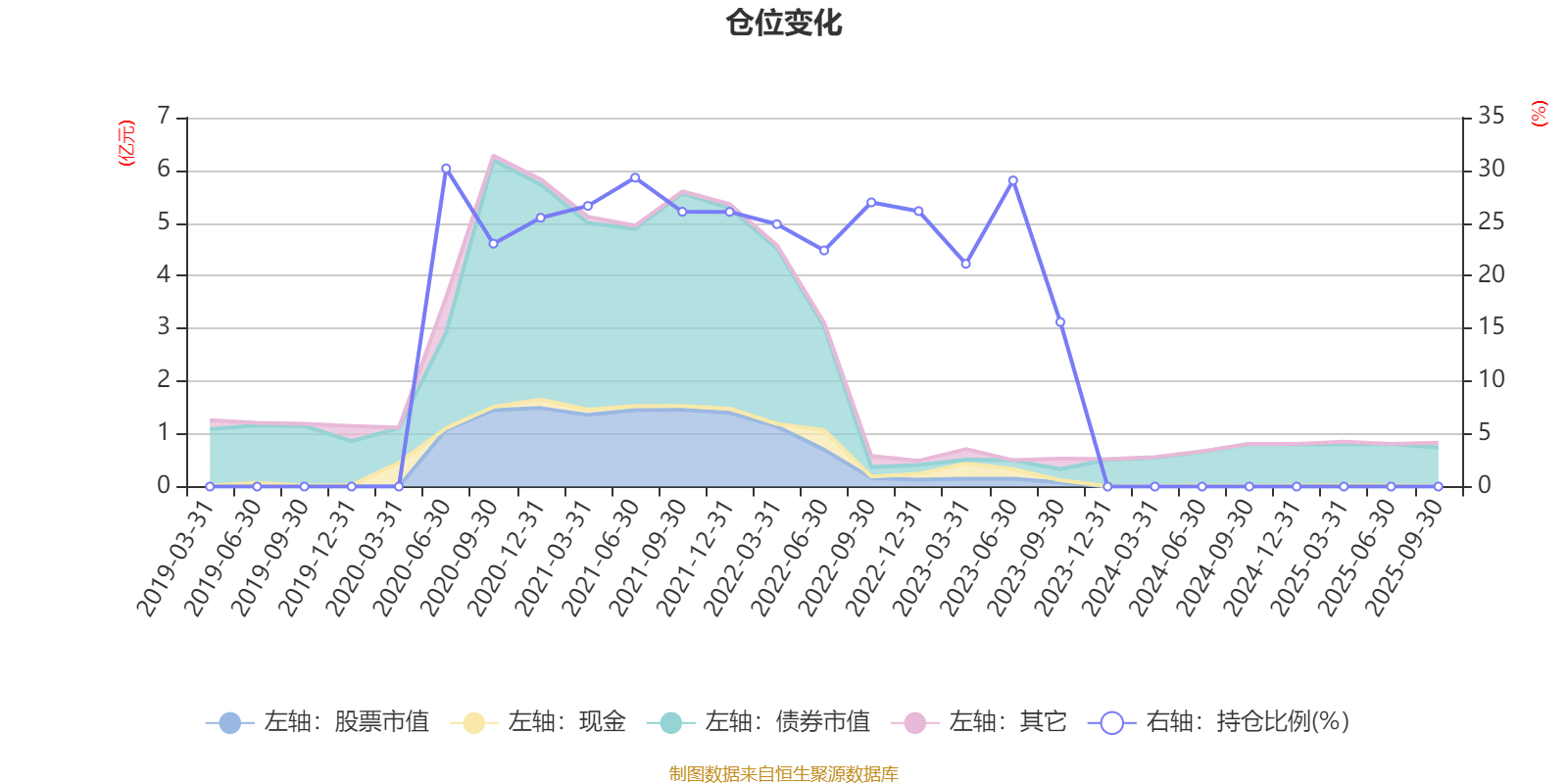 据定期报告数据统计,近三年平均股票仓位为7.66%,同类平均为19.34%。2020年上半年末基金达到30.18%的最高仓位,2023年三季度末最低,为15.61%。