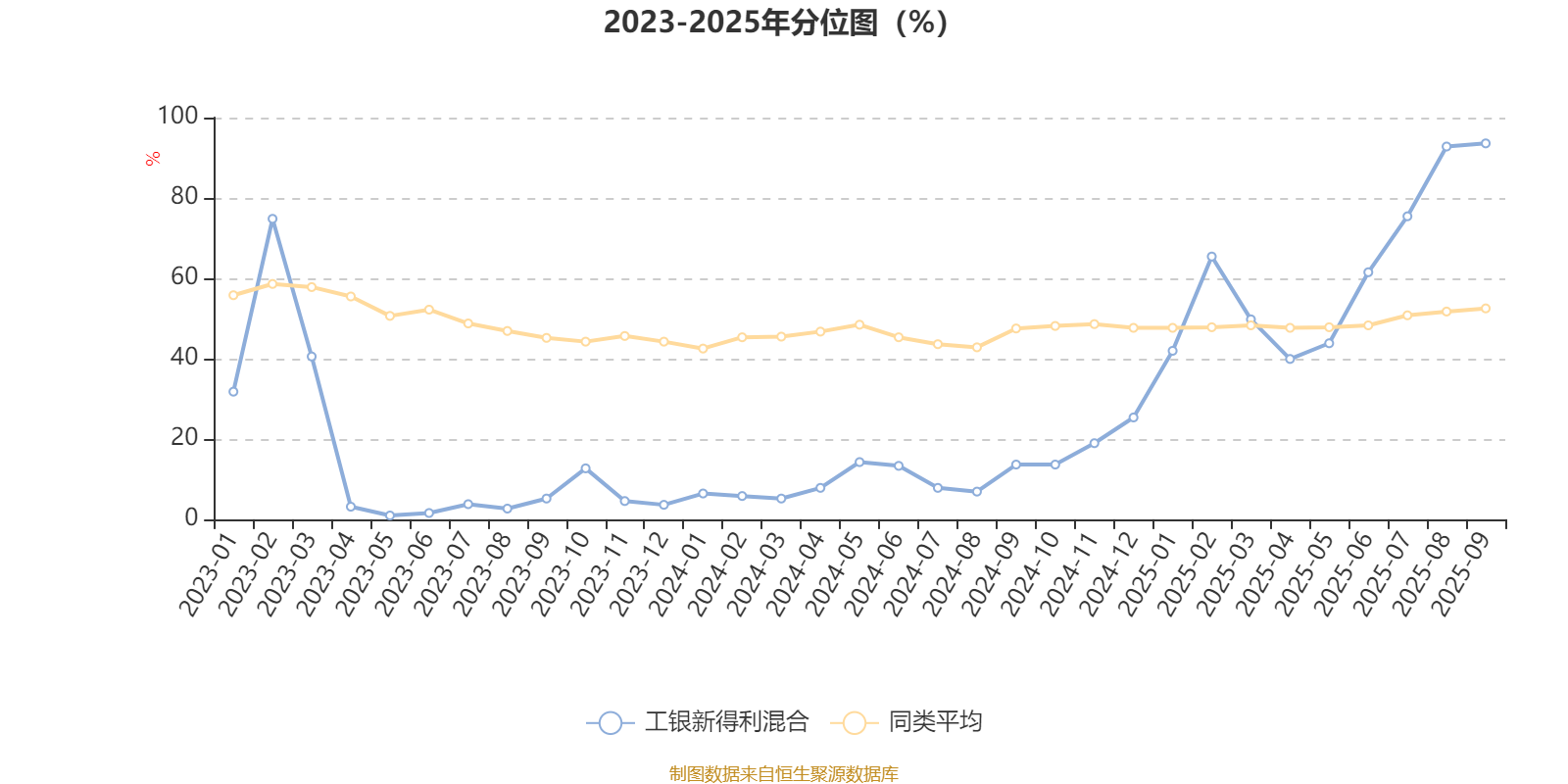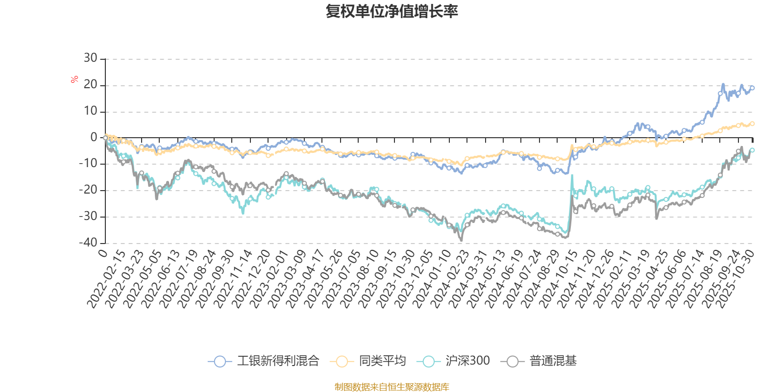 截至10月30日,工银新得利混合近三个月复权单位净值增长率为9.00%,位于同类可比基金31/664;近半年复权单位净值增长率为18.20%,位于同类可比基金21/664;近一年复权单位净值增长率为25.60%,位于同类可比基金14/664;近三年复权单位净值增长率为28.67%,位于同类可比基金27/618。