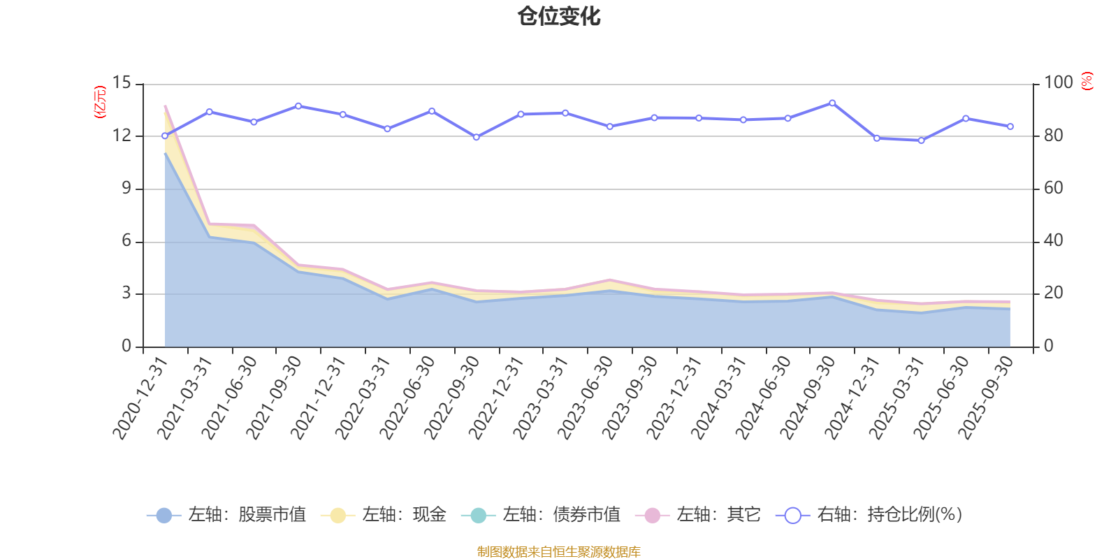 据定期报告数据统计,近三年平均股票仓位为85.81%,同类平均为85.66%。2024年三季度末基金达到92.73%的最高仓位,2025年一季度末最低,为78.49%。