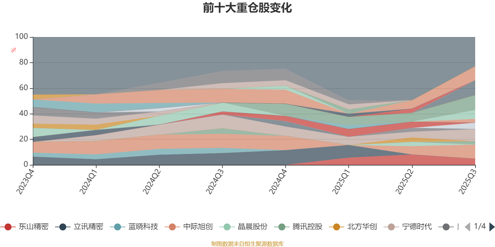 该基金持股集中度较高。截至2025年三季度末,基金十大重仓股分别是吉利汽车、工业富联、中际旭创、新易盛、宁德时代、沪电股份、生益科技、东山精密、中芯国际、腾讯控股。