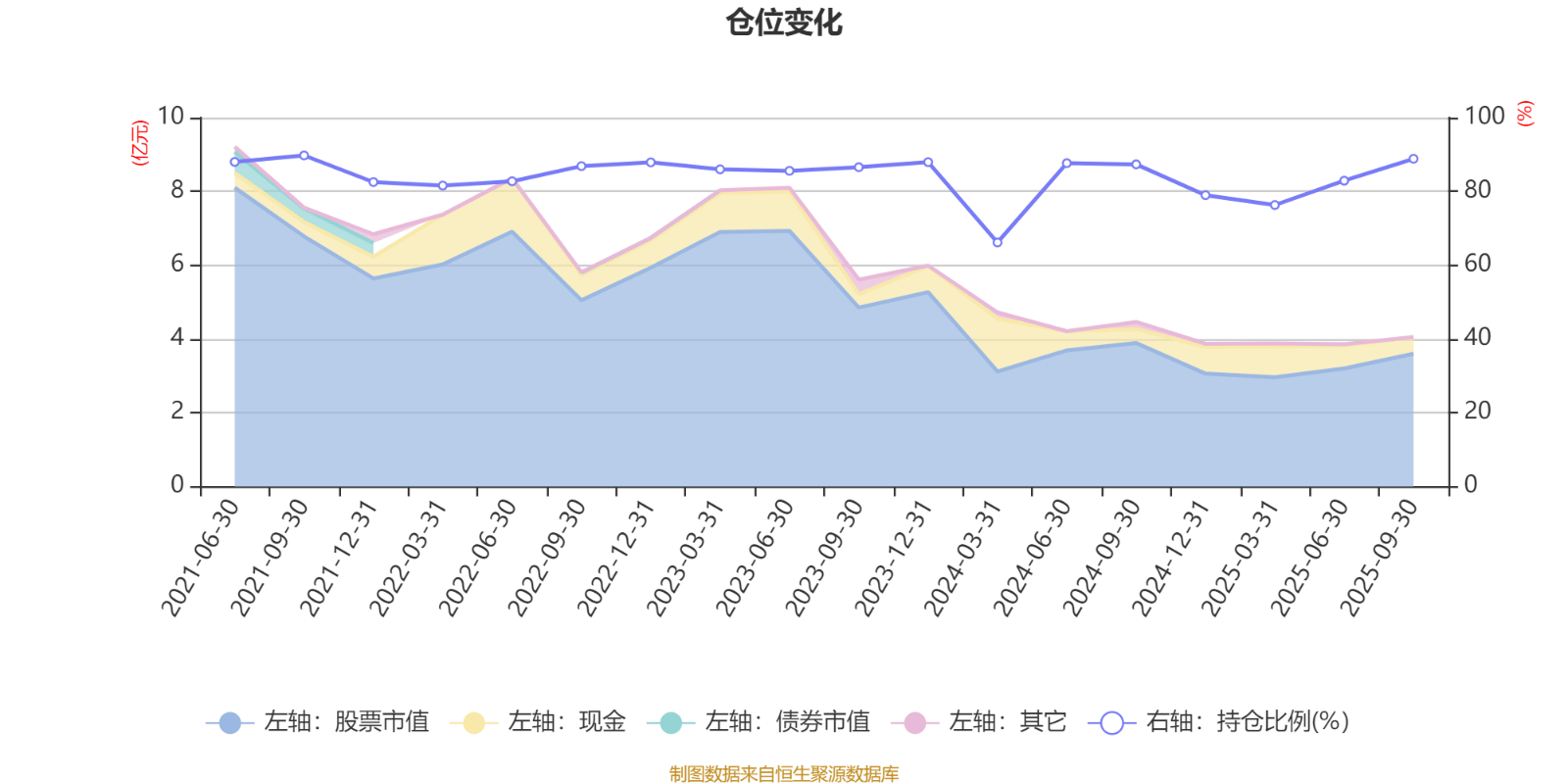 据定期报告数据统计,近三年平均股票仓位为83.51%,同类平均为86.93%。2021年三季度末基金达到89.75%的最高仓位,2024年一季度末最低,为66.16%。