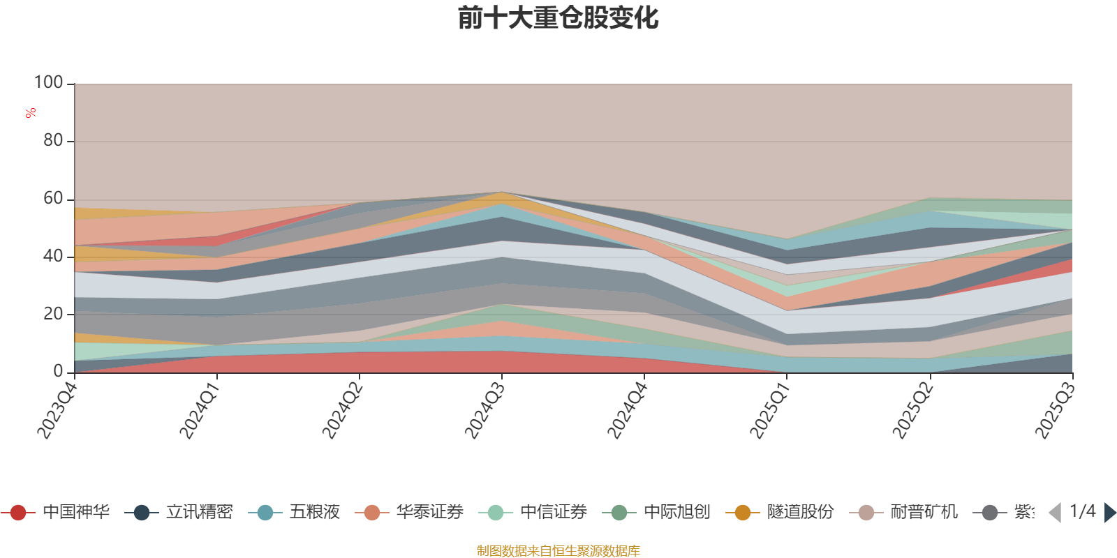 截至2025年三季度末,基金十大重仓股分别是贵州茅台、中际旭创、立讯精密、宁德时代、耐普矿机、新易盛、紫金矿业、开润股份、广发证券、东吴证券。