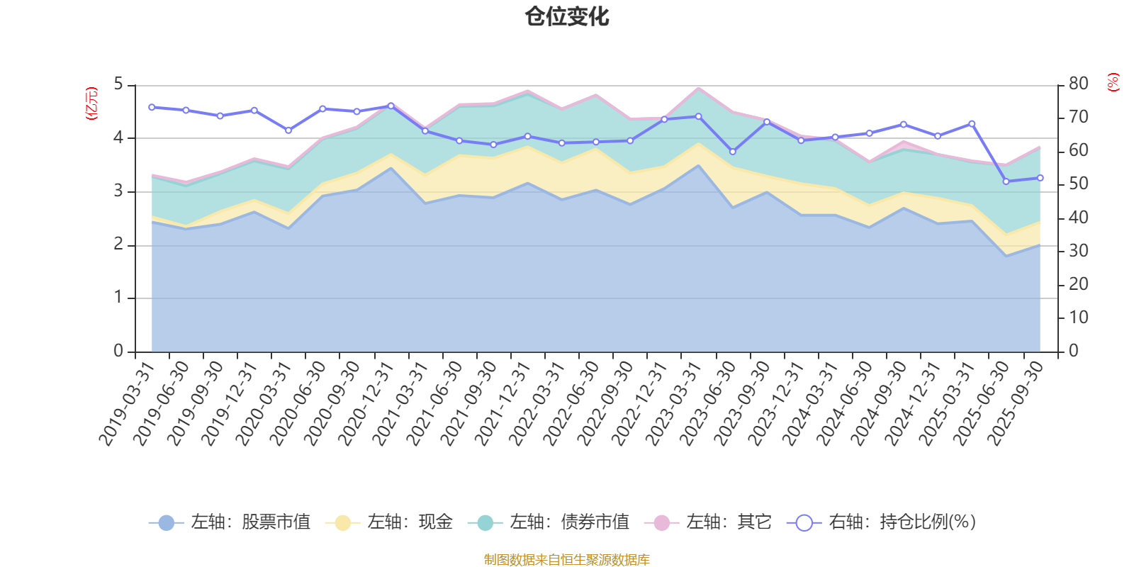 据定期报告数据统计,近三年平均股票仓位为63.94%,同类平均为72.35%。2020年末基金达到73.74%的最高仓位,2025年上半年末最低,为51.09%。