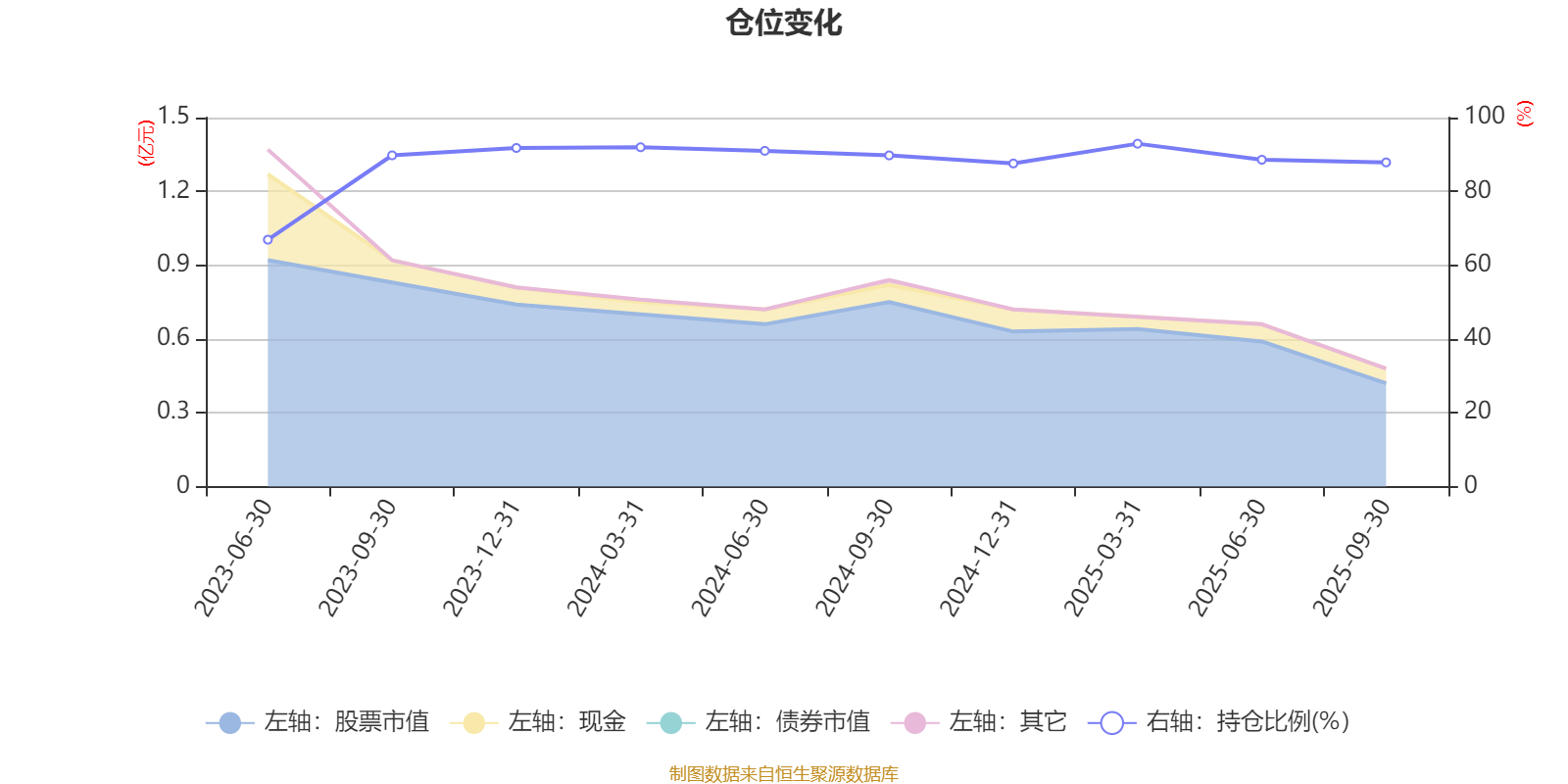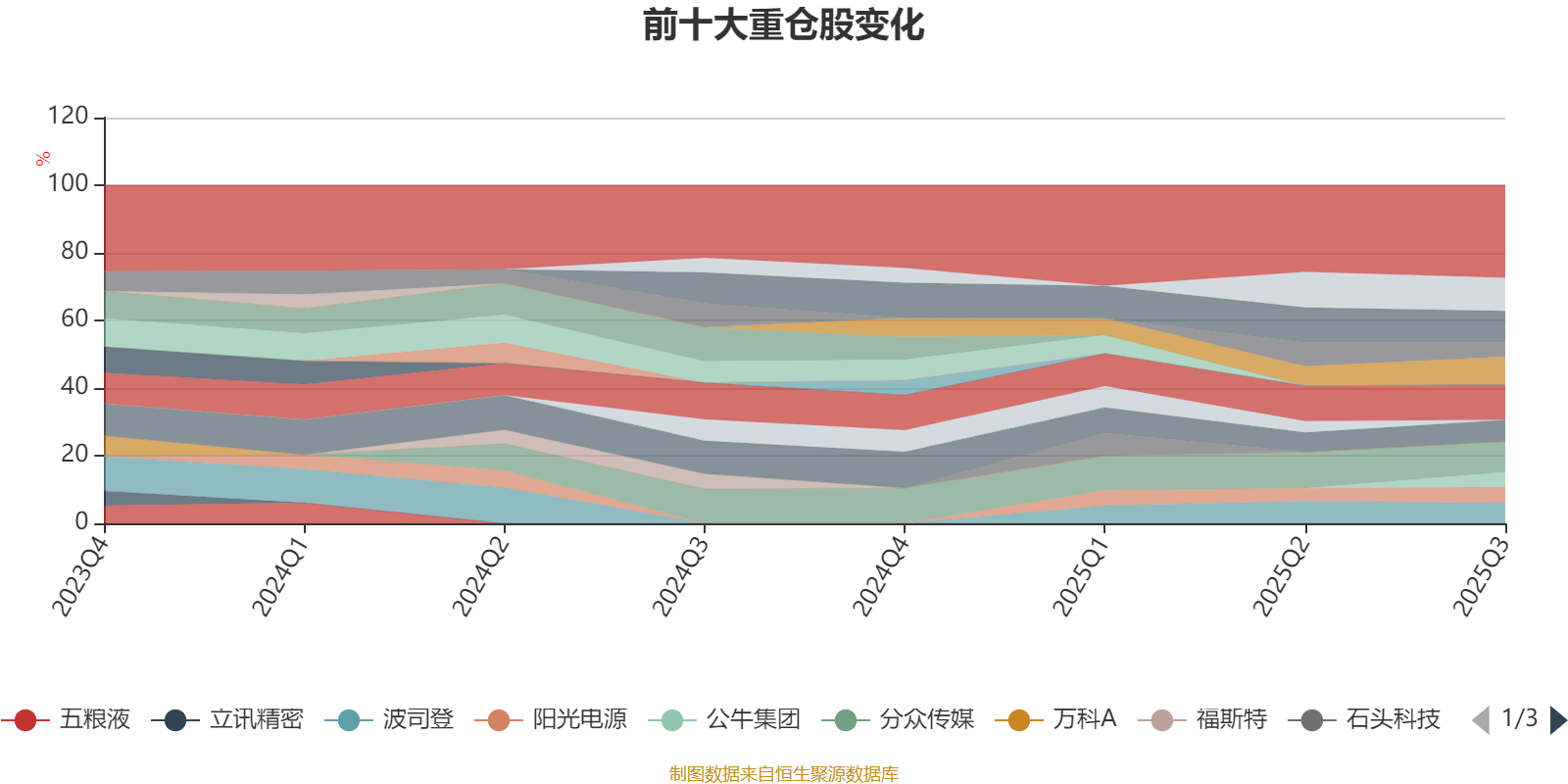 该基金持股集中度较高,近2年前十大重仓股集中度长期超过60%。截至2025年三季度末,基金十大重仓股分别是宁德时代、盐湖股份、京东方A、分众传媒、理想汽车-W、腾讯控股、波司登、阳光电源、公牛集团、云铝股份。