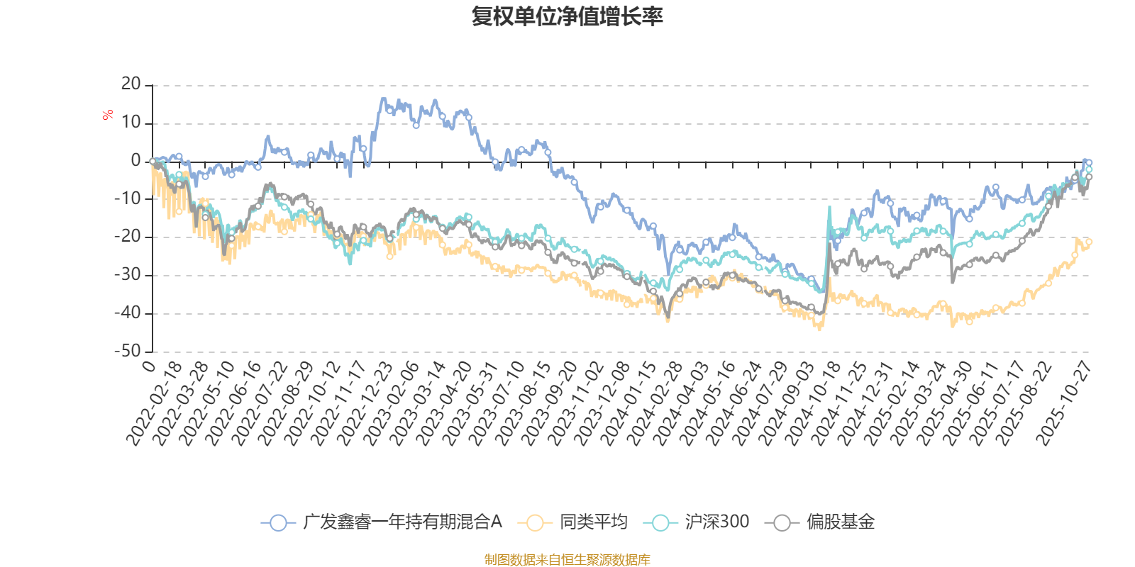截至10月27日,广发鑫睿一年持有期混合A近三个月复权单位净值增长率为6.01%,位于同类可比基金41/49;近半年复权单位净值增长率为17.35%,位于同类可比基金40/49;近一年复权单位净值增长率为23.92%,位于同类可比基金30/42;近三年复权单位净值增长率为-0.15%,位于同类可比基金25/29。