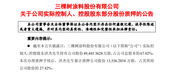 作为员工持股计划的兜底人,三棵树实控人洪杰部分股份已经质押。截至2025年9月24日,洪杰所持股份中的约1.4亿股处于质押中,占其所持公司股份的27.4%。