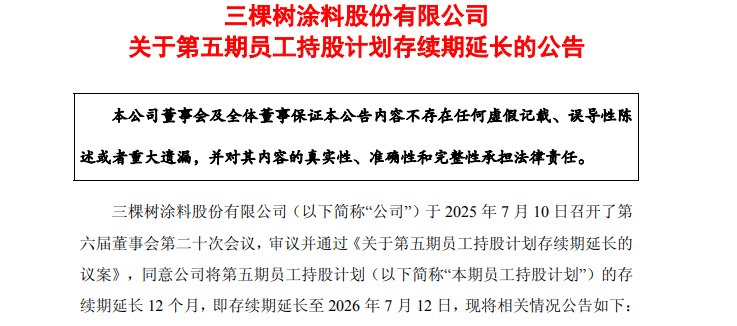 时间拉回2025年7月11日,这一天三棵树发布公告,公司第五期员工持股计划延期一年,即存续期延长至2026年7月12日。