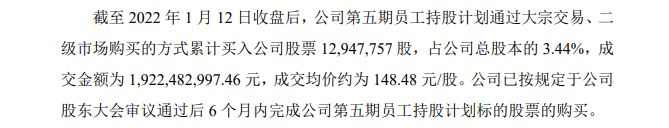 三棵树第五期员工持股计划是在三年多以前就完成的。2022年1月初,第五期员工计划出资19.2亿元、以成交均价约148.48元/股买入三棵树1295万股,占公司总股本的3.44%。