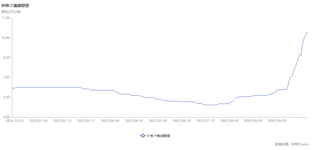 消息面上,自9月中旬以来,六氟磷酸锂价格开启快速上行通道,最近更是出现跳跃式上涨。Choice数据显示,10月30日国内六氟磷酸锂价格报10.50万元/吨,较9月末的6.10万元/吨上涨72%。