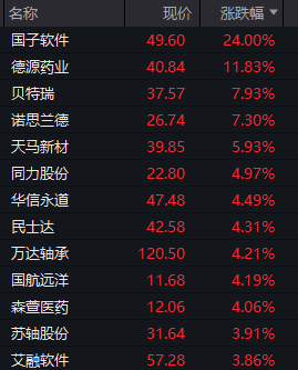 北交所早盘一枝独秀。截至午盘,北证50指数上涨3.43%,50只成分股有48只股价飘红,国子软件大涨24%,德源药业涨超11%,贝特瑞、诺思兰德涨超7%。