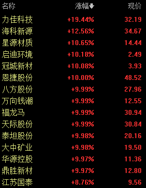 昨日大涨后,锂电池板块今日早盘继续爆发,恩捷股份、天际股份、冠城新材等多股均在开盘5分钟内触及涨停。截至午盘,天际股份、福龙马等收获两连板,恩捷股份、冠城新材、万向钱潮同样涨停,力佳科技、海科新源、星源材质涨超10%。