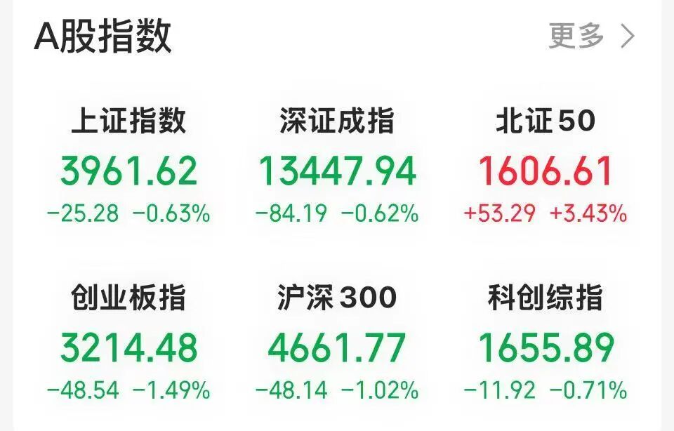今日早盘,A股主要股指走势分化。多只AI主线热门股高位回调,万亿市值工业富联跌超7%,拖累股指回落。截至午间休市,上证指数报3961.62点,跌0.63%;深证成指、创业板指分别下跌0.62%和1.49%;北交所“一枝独秀”,北证50指数半日上涨3.43%。