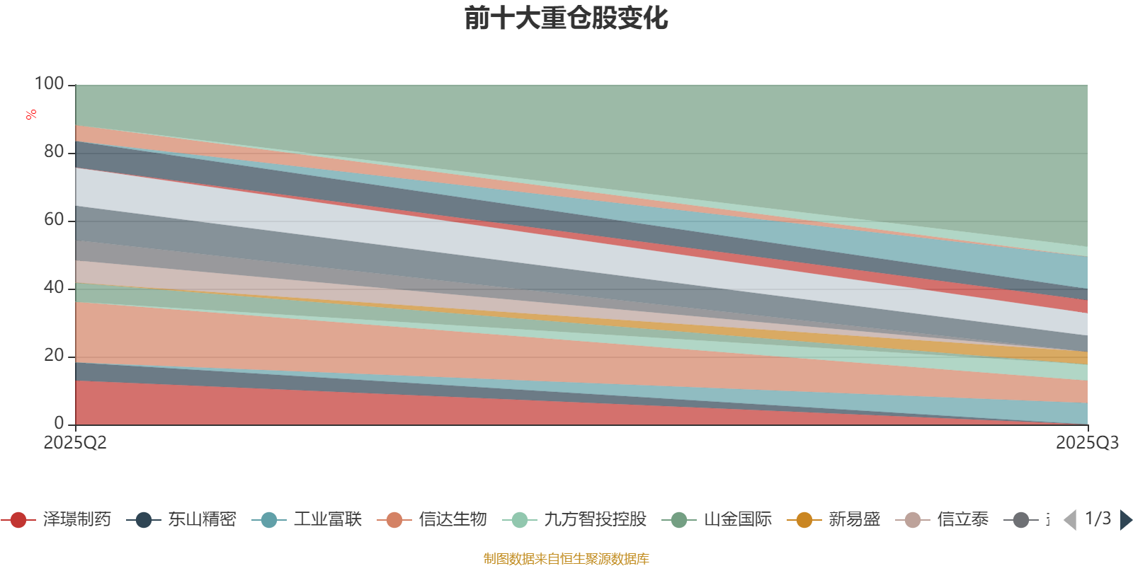 该基金持股集中度较高。截至2025年三季度末,基金十大重仓股分别是寒武纪、三生制药、信达生物、工业富联、九方智投控股、舒泰神、紫金矿业、新易盛、热景生物、阿里巴巴-W。