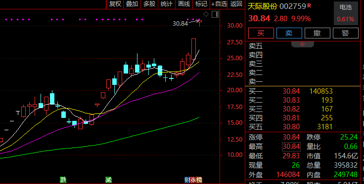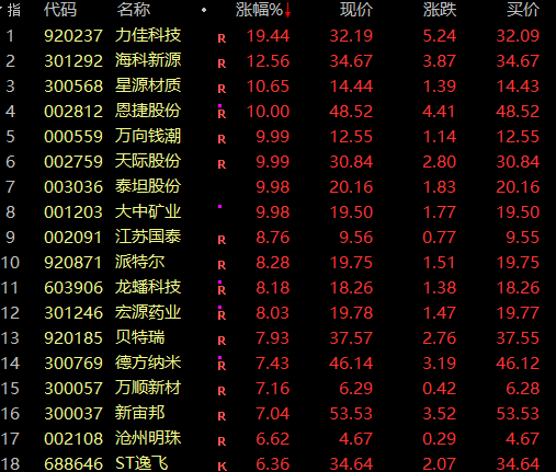 固态电池也是早间热点之一,板块指数一度放量大涨逾3%,创历史新高,同样连续7日上涨。力佳科技盘中冲击30%涨停,大中矿业、泰坦股份等多股开盘一字涨停,恩捷股份、万向钱潮等亦均在一两分钟内快速涨停。