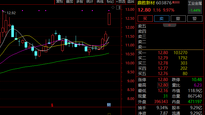 早间,电池产业链全线走强,钠电池方向领涨,板块指数盘初一度直线拉升涨逾3%,日K线上7连涨,创3年多来新高。鼎胜新材(603876)高开后秒速涨停,天际股份也不到1分钟封板,百合花、星源材质等涨停或涨超10%。