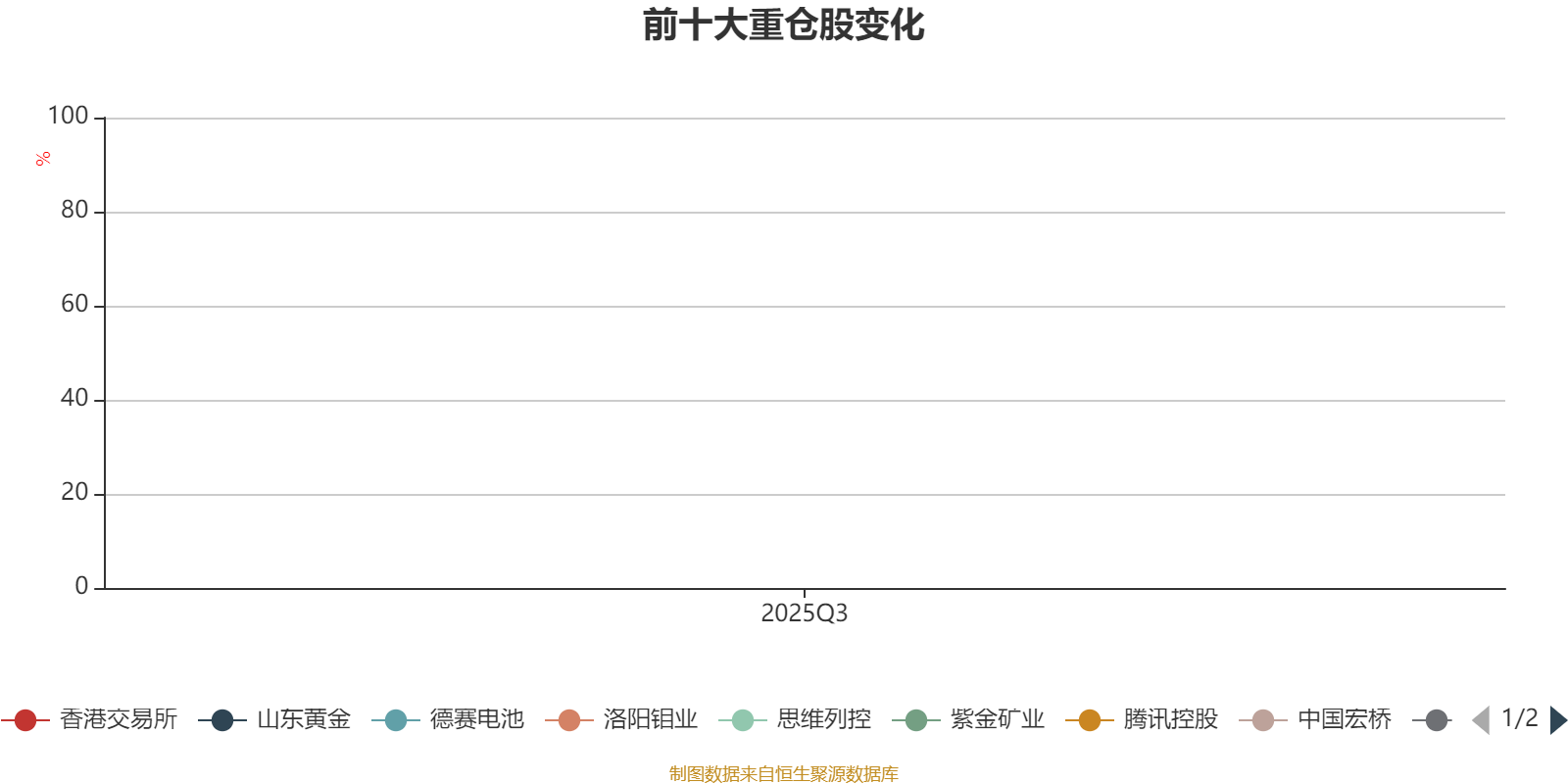 截至2025年三季度末,基金十大重仓股分别是阿里巴巴-W、腾讯控股、香港交易所、洛阳钼业、山东黄金、思维列控、杭州银行、中国宏桥、德赛电池、紫金矿业。