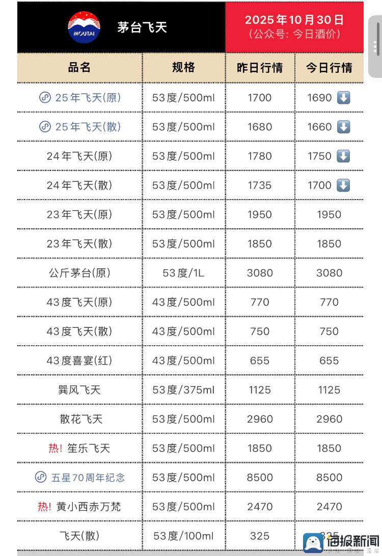 贵州茅台飞天茅台价格成为行业风向标,10月30日“今日酒价”数据显示,53度飞天茅台散瓶批价跌至1660元/瓶,较前日再度下跌20元/瓶,再次刷新上市以来新低价,市场担忧后续或即将到达1499元/瓶官方指导价。尽管华创证券提及茅台批价企稳在1800元/瓶左右,但终端实际成交价已形成明显下行趋势,这一价格波动不仅影响茅台自身渠道信心,更对五粮液、泸州老窖等高端竞品形成向下挤压。