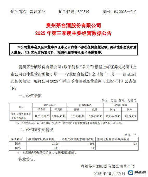 贵州茅台2025年第三季度主要经营数据报告