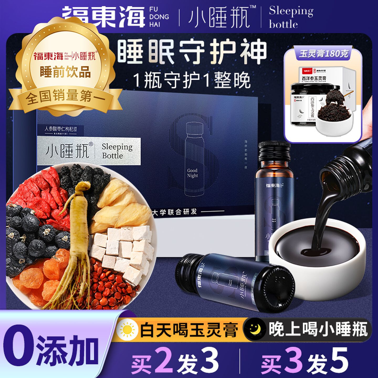 “夜深了,小睡袋陪你酣然入梦”,在某电商平台,一款名为“小睡袋人参酸枣仁枸杞原浆”的产品在产品详情页面介绍称,“睡眠有深度,睡醒很舒服”“听100遍摇篮曲,不如喝1袋酸枣仁原液”,这款产品来自“福东海旗舰店”,在该店内还售有小睡瓶、枸杞原浆等产品。