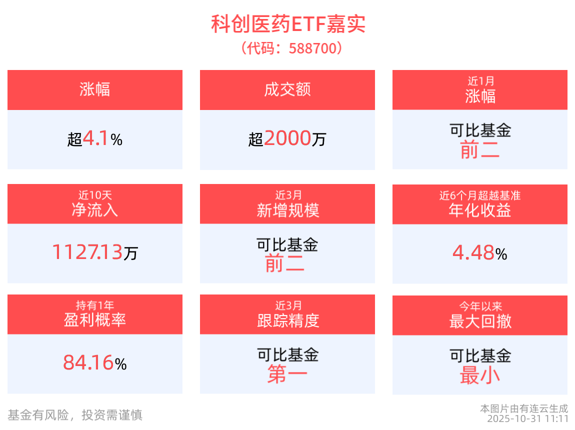 截至2025年10月31日 11:11,上证科创板生物医药指数强势上涨4.01%,成分股三生国健上涨20.00%,迈威生物上涨11.50%,泽璟制药上涨11.02%,荣昌生物,微芯生物等个股跟涨。科创医药ETF嘉实(588700)上涨4.16%。