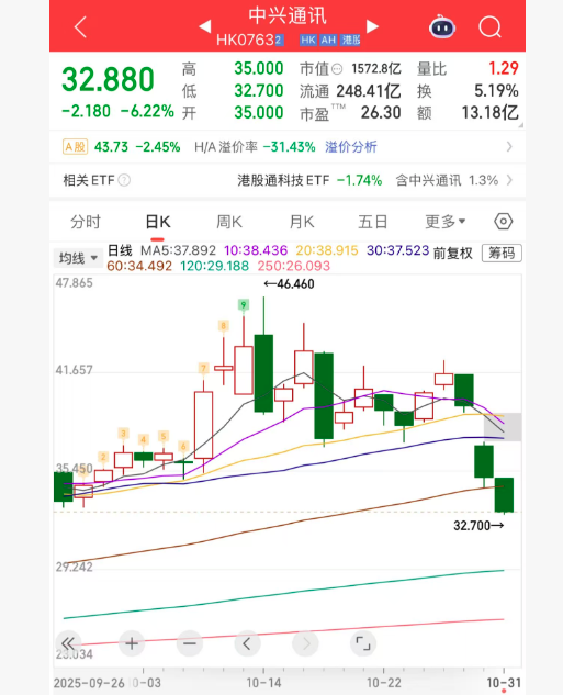 上证报中国证券网讯(记者李五强)10月31日,中兴通讯H股跌6.22%,截至13时54分,报32.88港元/股,成交额13.18亿港元。中兴通讯已连续三个交易日下跌,累计跌幅超过20%。