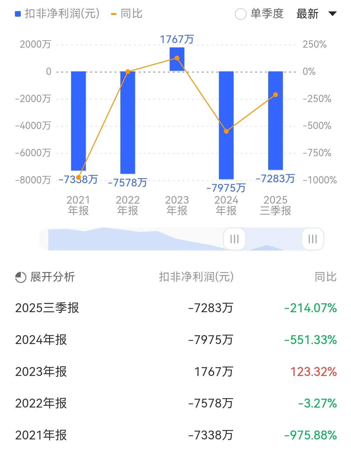 而2025年前三季度,公司扣非净利润亏损进一步扩大,由去年同期-2319万元增加至-7282.55万元,亏损额增幅达214%。