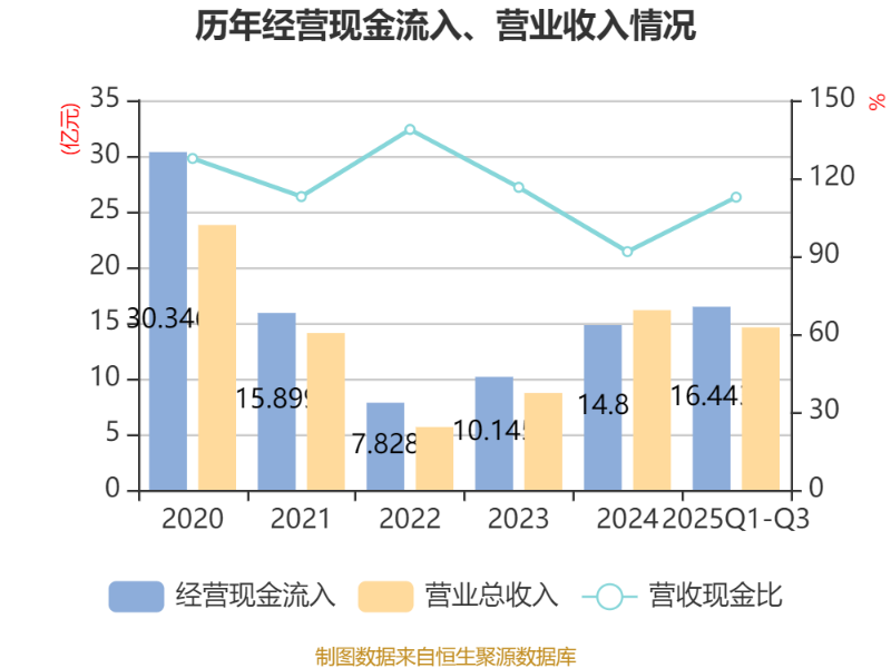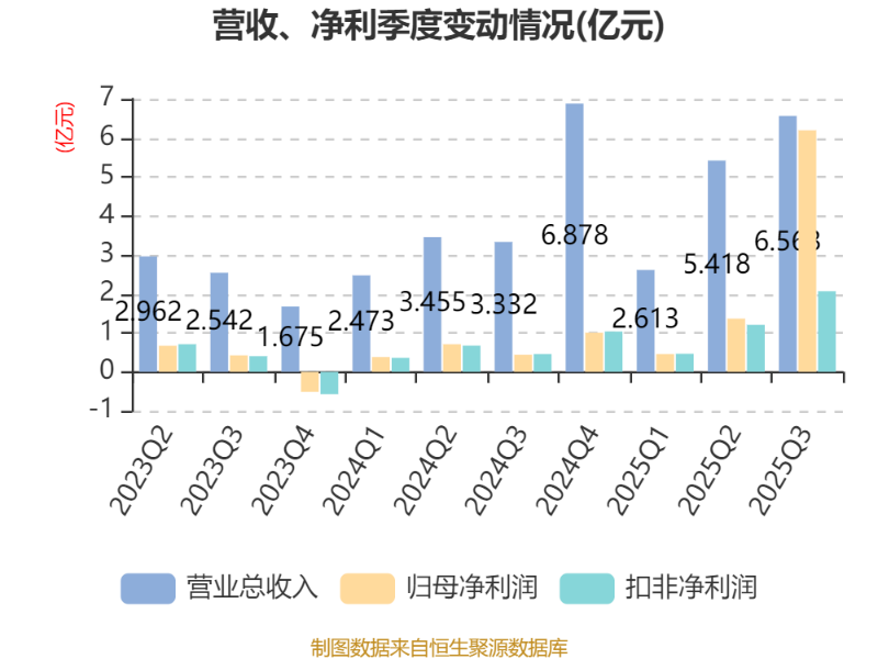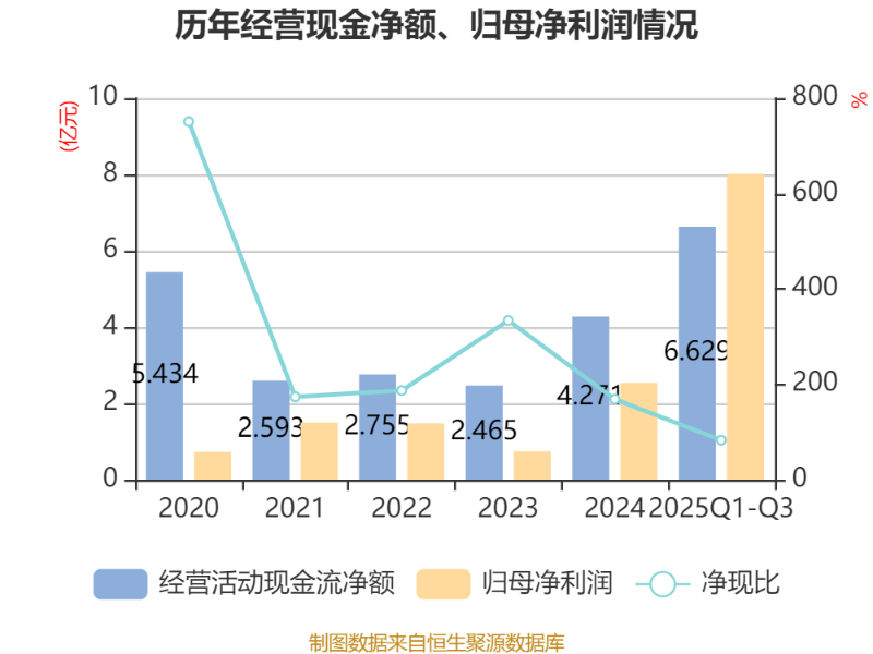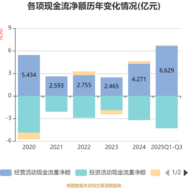 2025年前三季度,公司经营活动现金流净额为6.63亿元,同比增长188.59%;筹资活动现金流净额1279.6万元,同比增加1.12亿元;投资活动现金流净额-4.31亿元,上年同期为-2.09亿元。