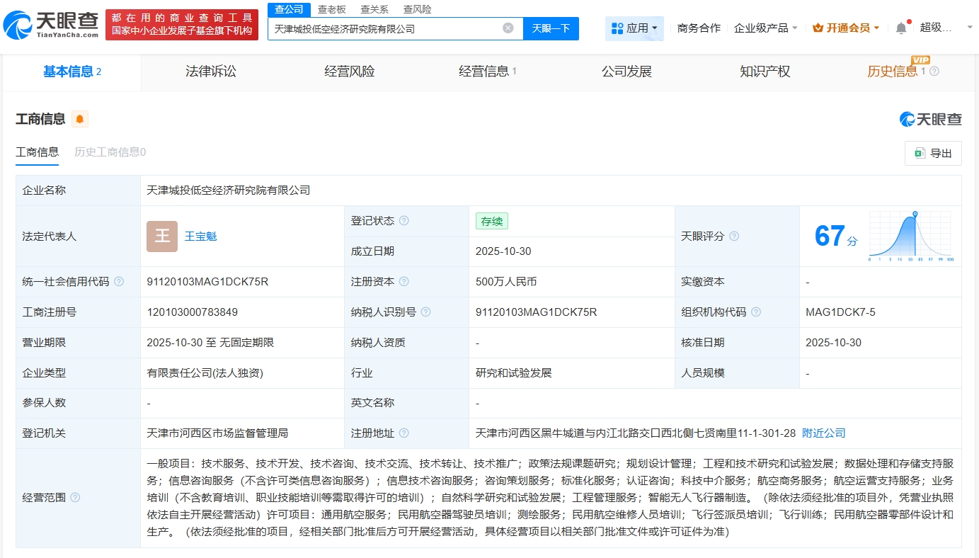 每经AI快讯,天眼查App显示,近日,天津城投低空经济研究院有限公司成立,法定代表人为王宝魁,注册资本500万元人民币,经营范围包括工程和技术研究和试验发展、自然科学研究和试验发展、智能无人飞行器制造等。股权全景穿透图显示,该公司由天津低空经济投资发展有限公司全资持股,后者为天津城市基础设施建设投资集团有限公司全资子公司。