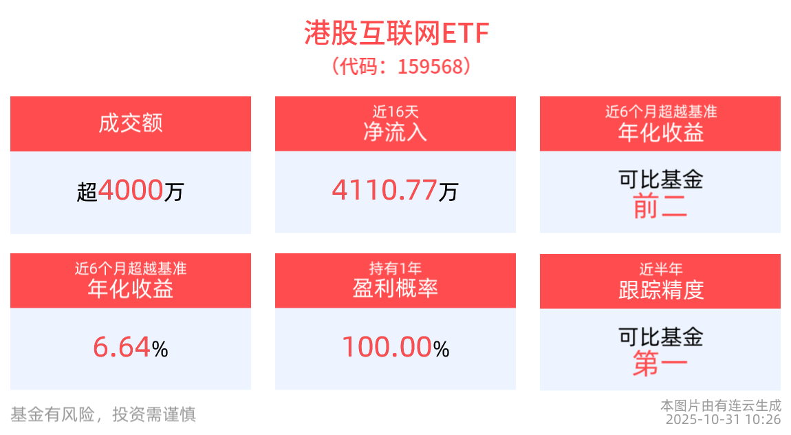 流动性方面,港股互联网ETF盘中换手10.62%,成交4129.60万元,市场交投活跃。拉长时间看,截至10月30日,港股互联网ETF近1年日均成交2.19亿元。